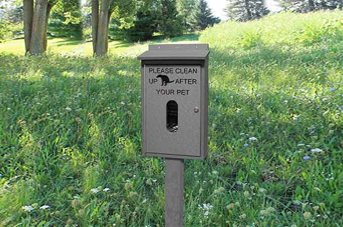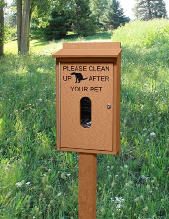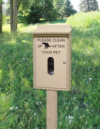 Our pet waste dispenser is conveniently mounted on a 6′ 4×4 post. The mounted bag dispenser features designated waste signage to encourage your patrons and citizens to clean up after their pets. Each pet bag dispenser features a stainless steel key-lock to keep your header and boxed-style pet waste bags secure. With stainless steel fasteners and recycled HDPE plastic, this pet waste dispenser is designed to last in any weather.