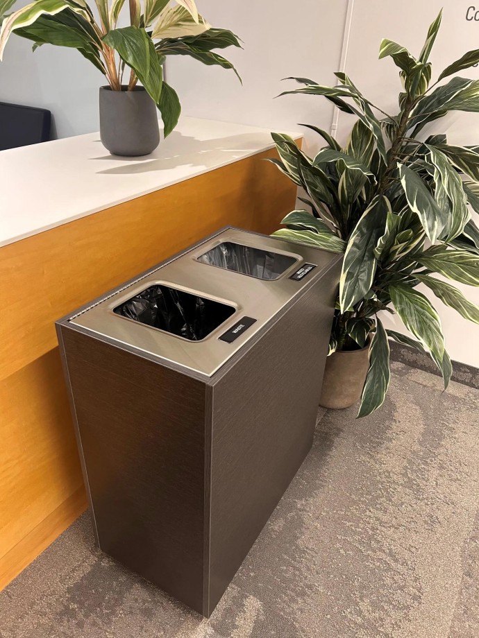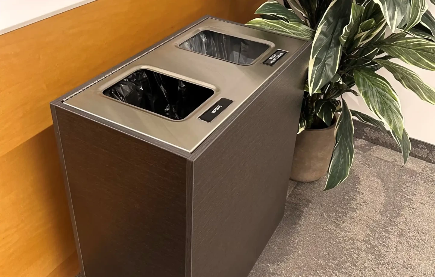 The Aristata Slate Triple Stream’s recycling station’s sleek design features a stainless steel top and a modern slate finish. These triple stream recycling and waste containers are the perfect complement for any modern or contemporary decor, including office boardrooms & break rooms.