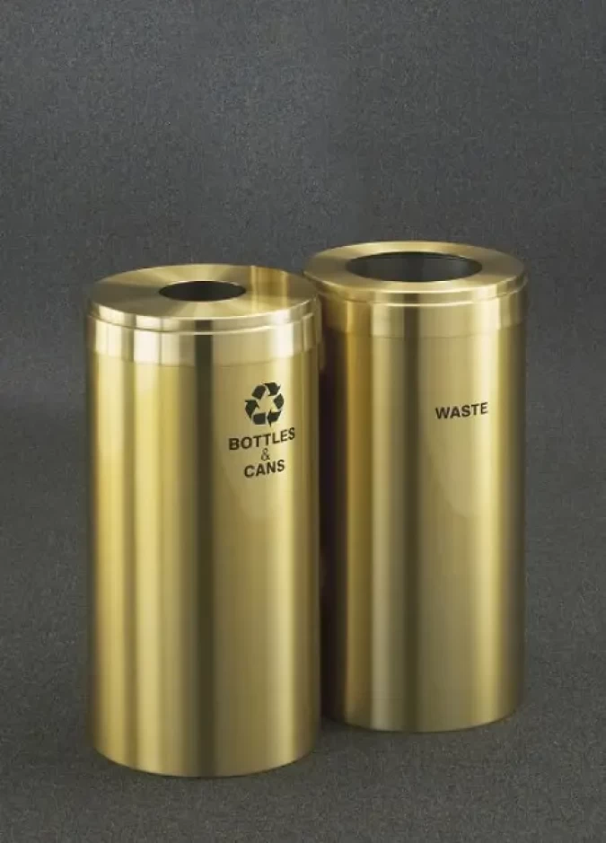 Each RecyclePro is double wall fire-safe; built with recycled aluminum. Choose from satin aluminum or tarnish-proof satin brass. Alternatively choose one of many powder coat colors; finished on recycled galvanized steel. Also, mix and match each waste stream with any of the aforementioned finishes.