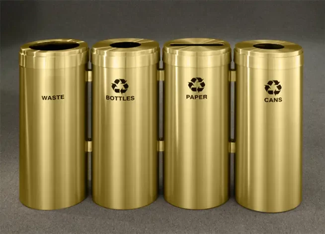 Each RecyclePro is double wall fire-safe; built with recycled aluminum. Choose from satin aluminum or tarnish-proof satin brass. Alternatively choose one of many powder coat colors; finished on recycled galvanized steel. Also, mix and match each waste stream with any of the aforementioned finishes.