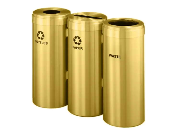 Each RecyclePro is double wall fire-safe; built with recycled aluminum. Choose from satin aluminum or tarnish-proof satin brass. Alternatively choose one of many powder coat colors; finished on recycled galvanized steel. Also, mix and match each waste stream with any of the aforementioned finishes.