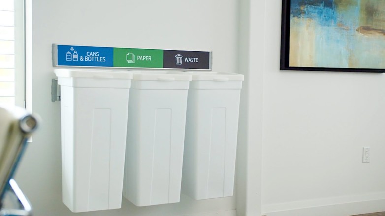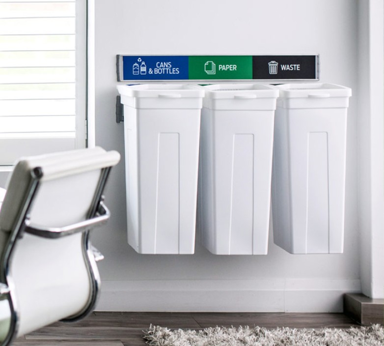 The Aristata Slate Triple Stream’s recycling station’s sleek design features a stainless steel top and a modern slate finish. These triple stream recycling and waste containers are the perfect complement for any modern or contemporary decor, including office boardrooms & break rooms.