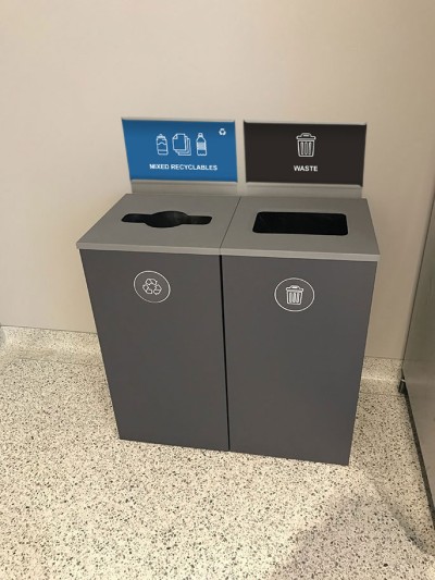 The Aristata Slate Triple Stream’s recycling station’s sleek design features a stainless steel top and a modern slate finish. These triple stream recycling and waste containers are the perfect complement for any modern or contemporary decor, including office boardrooms & break rooms.