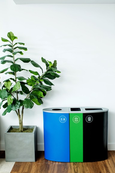 The Aristata Slate Triple Stream’s recycling station’s sleek design features a stainless steel top and a modern slate finish. These triple stream recycling and waste containers are the perfect complement for any modern or contemporary decor, including office boardrooms & break rooms.
