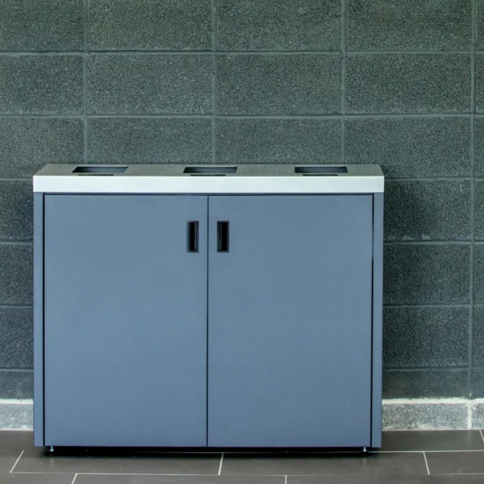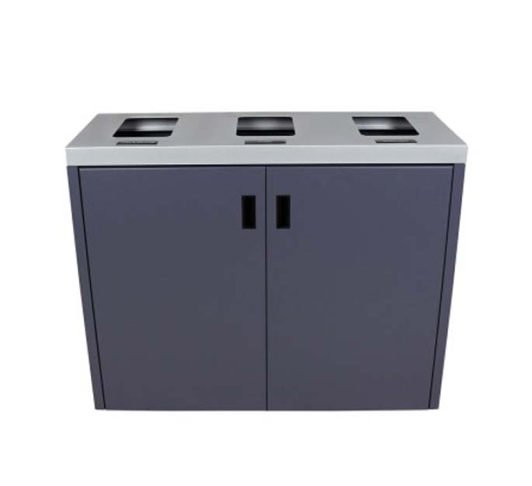 The Aristata Slate Triple Stream’s recycling station’s sleek design features a stainless steel top and a modern slate finish. These triple stream recycling and waste containers are the perfect complement for any modern or contemporary decor, including office boardrooms & break rooms.