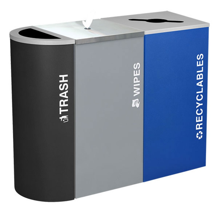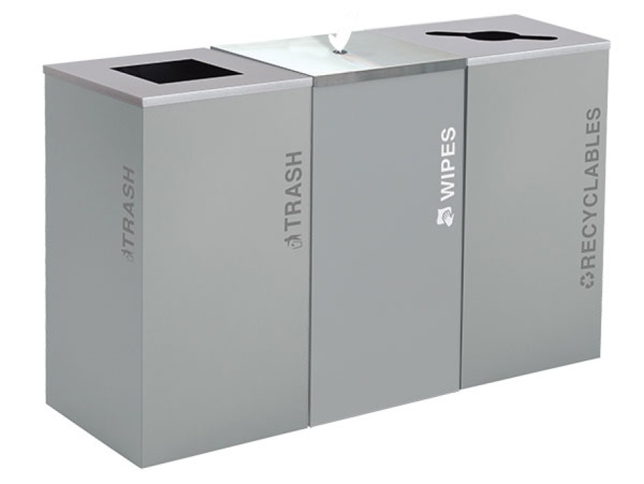 The Aristata Slate Triple Stream’s recycling station’s sleek design features a stainless steel top and a modern slate finish. These triple stream recycling and waste containers are the perfect complement for any modern or contemporary decor, including office boardrooms & break rooms.