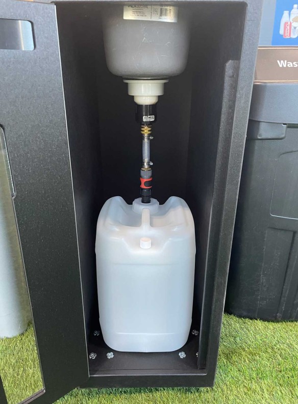 • Plexiglass Window: Provides clear visibility of the liquid level in the jerry cans, allowing for timely disposal.